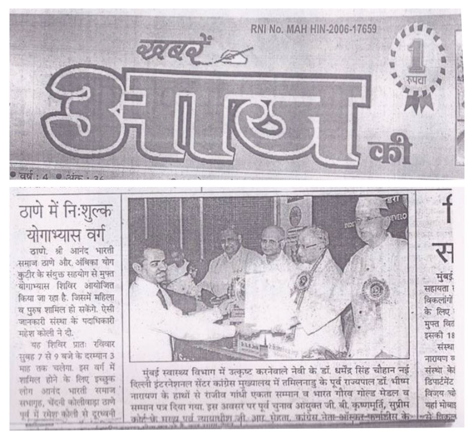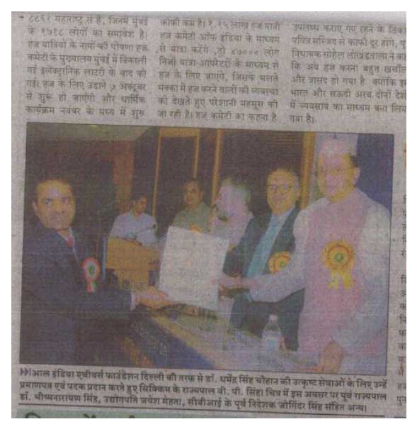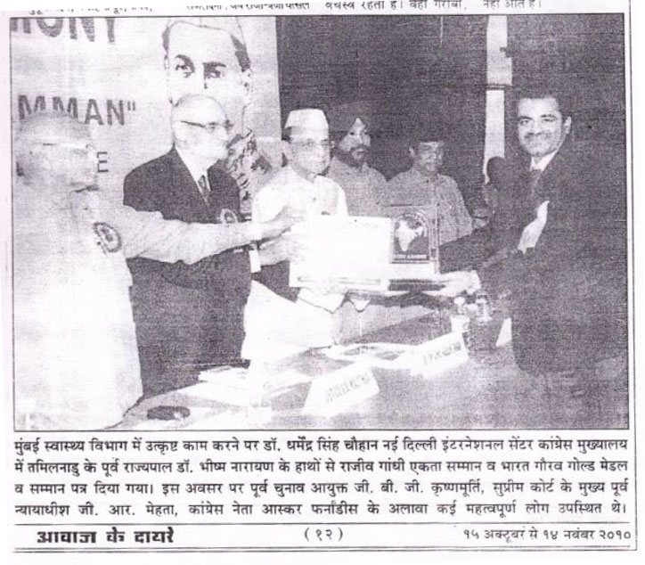 Rajeev Gandhi Award received at New Delhi (The International Centre Congress Headquarter) by Former Governor of Tamil Nadu, Dr. Bhishma Narayan, covered by leading Hindi newspaper