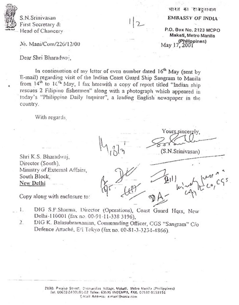 Letter of Appreciation by Embassy of India for successful Medical Rescue Operation conducted of Manila during cyclone